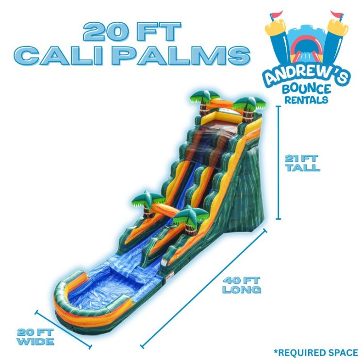 Imagine stepping into a tropical escape with the 20ft Cali Palms inflatable waterslide. It's like your backyard turns into a sunlit paradise, complete with towering palm trees and a thrilling ride. This massive slide is perfect for adrenaline junkies seeking a heart-racing rush down a bright, colorful slope. Whether it's soaking up a summer day or hosting the ultimate party, the Cali Palms ensures endless fun and excitement where every climb feels like an ascent to paradise.